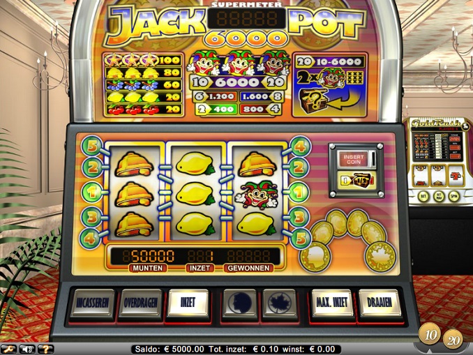 De fruitautomaat Jackpot 6000 telt in totaal 5 winlijnen als je met de maximale inzet speelt. De minimale inzet zal alleen maar 1 winlijn activeren. Je kunt de inzet verhogen en door op een max. inzet te klikken speel je meteen met de maximale inzet. Ook de prijzen zullen hoger worden als je de inzet verhoogd. Bij een inzet van 20 credits kan je met twee jokers in beeld al meteen 10 tot 6000 credits winnen.